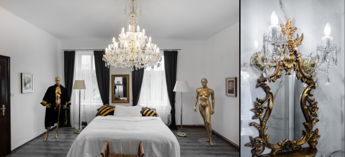 Welches Zimmer ist noch übrig? Das Schlafzimmer! Der elegante Kristallkronleuchter mit einem Durchmesser von 1 Meter darf auch hier nicht fehlen.