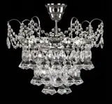 Eine kleine Deckenleuchte zieht mit ihrer reichen Dekoration in mehreren Ebenen Aufmerksamkeit auf sich. Schön polierte Anhänger aus Kristall in Form von Pyramiden und Mandeln beugen sowohl künstliches Licht als auch Tageslicht in alle Farben des Regenbogens. Mit seinen Abmessungen eignet sich der Kronleuchter für Standard-Wohnungen, zu denen er den Luxus der Qualität tschechischen Kristall hinzufügt. Wir bieten goldene oder silberne Variante an.