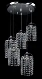Der Kronleuchter besteht aus fünf separaten Leuchtelementen, die jeweils mit Ketten aus präzise geschliffenen Kristallbehängen in Zylinderform verziert sind. Künstliches Licht und Tageslicht werden in diesen Behängen wunderschön gebrochen und erzeugen ein subtiles Schimmern, das dem Raum eine beeindruckende Atmosphäre verleiht.
